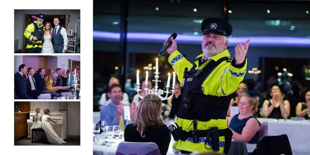 After a few family pictures were taken inside, the couple and their guests sat down for speeches and dinner, only to be interrupted by a Policeman! Cameoflage strikes again! Gregg always get the party going!