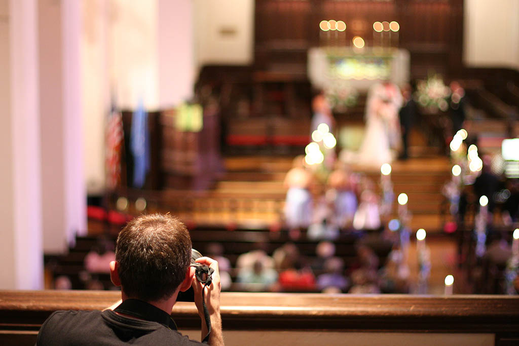 If you talk to any professional photographer they will all have stories of how they missed the first glance from the groom looking for his bride due to guests stepping into their path. Also, professional photographers can be restricted in some churches as to where they are allowed to take photographs from so having your guests remain in their seats will make their job much easier.